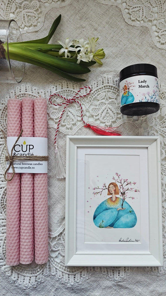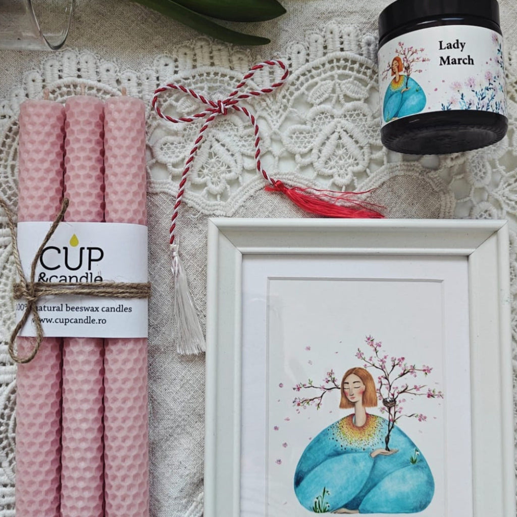 #Cadou. Cutie cadou #LadyMarch. Lumânare #goodmood, ilustrație cu ramă, lumânări din ceară de albine verde