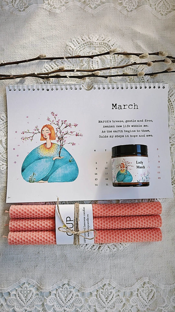 #Cadou. Cutie cadou lumânare #LadyMarch + calendar Andreea Molocea + lumânări din ceară de albine
